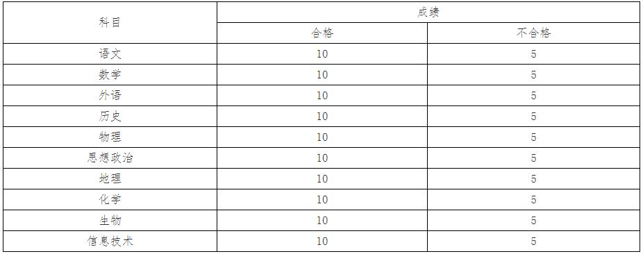我校根據(jù)考生普通高中學(xué)業(yè)水平合格性考試科目合格或不合格情況折算成具體分?jǐn)?shù),根據(jù)折算后的各科目總成績(jī)錄取。具體折算方法如下表: