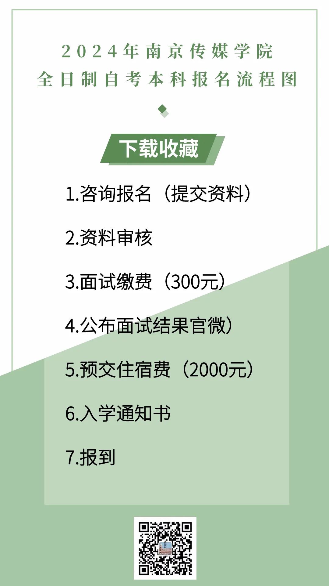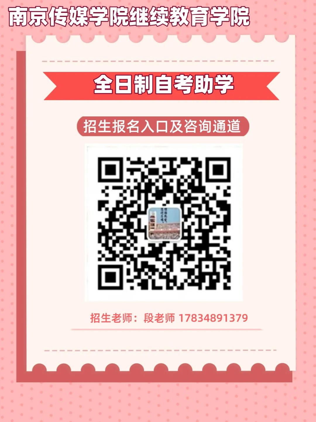 4 # 招生對象 # 2024屆三年制大專畢業(yè)生、五年一貫制大專畢業(yè)生 # 報考條件 # 1、熱愛祖國、遵紀守法、舉止端莊、身心健康、興趣高雅、具有良好的道德品質(zhì) 2.??破瘘c本科的考生必須是已經(jīng)取得經(jīng)教育部審定核準的國民教育系列高等學?;蚋叩冉逃詫W考試機構頒發(fā)的??飘厴I(yè)證書。 # 招生專業(yè) # 播音與主持藝術 舞蹈表演與編導 影視表演 音樂學 新聞學 平面攝影 航空攝影(無人機) 網(wǎng)絡與新媒體 數(shù)字媒體藝術 廣告學 廣播電視學 電競解說與主播 電影學 影視攝影制作 戲劇影視導演 戲劇影視文學 動畫/漫畫 視覺傳達設計(與南藝聯(lián)合辦學) 環(huán)境設計(與南藝聯(lián)合辦學) 服裝與服裝設計 #學歷/學位證書 # 學生通過相應考試且成績合格,可獲高等教育自學考試委員會頒發(fā)的南京傳媒學院署印的自學考試本科畢業(yè)證書;符合學士學位授予條件者,可授予學士學位。 技能資格證書 學生可根據(jù)所學專業(yè),在校自愿考取相應的職業(yè)資格證書。 # 報名流程# 火爆預報中,各專業(yè)報滿截止 ↓趕緊掃描下方二維碼↓ 微信號|17834891379 南京傳媒學院|段老師