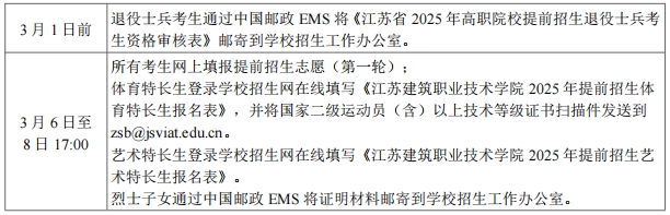 2.退役士兵須于3月1日前用中國郵政EMS將填寫的《江蘇省2025年高職院校提前招生退役士兵考生資格審核表》(見附件1)郵寄到學校招生工作辦公室,方可參加網上填報專業(yè)志愿。