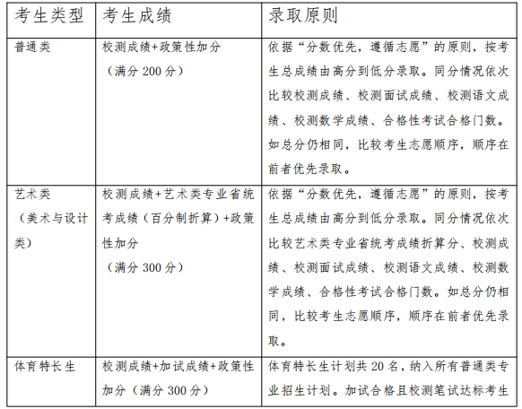 第十四條我院對(duì)報(bào)考普通類(lèi)專(zhuān)業(yè)考生采取“校測(cè)成績(jī)+政策性加分”、藝術(shù)類(lèi)專(zhuān)業(yè)考生采取“校測(cè)成績(jī)+藝術(shù)類(lèi)專(zhuān)業(yè)省統(tǒng)考成績(jī)(百分制折算)+政策性加分”、體育特長(zhǎng)生采取“校測(cè)成績(jī)+體育特長(zhǎng)生加試成績(jī)+政策性加分”、藝術(shù)特長(zhǎng)生采取“校測(cè)成績(jī)+藝術(shù)特長(zhǎng)生加試成績(jī)+政策性加分”的形式進(jìn)行考核。