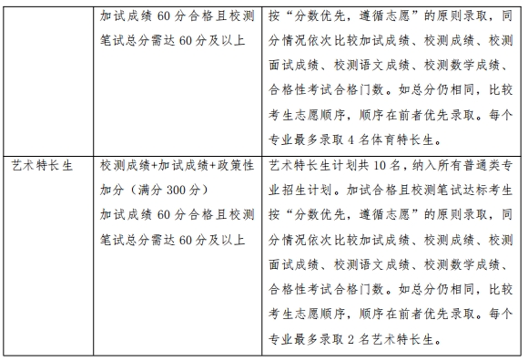 第二十條體育特長(zhǎng)生、藝術(shù)特長(zhǎng)生,根據(jù)計(jì)劃數(shù)和考生總分,單獨(dú)劃線提前錄??;未被錄取的考生,根據(jù)其在省教育考試院網(wǎng)上報(bào)名時(shí)的志愿信息按普通類(lèi)專(zhuān)業(yè)報(bào)考及錄取原則錄取。