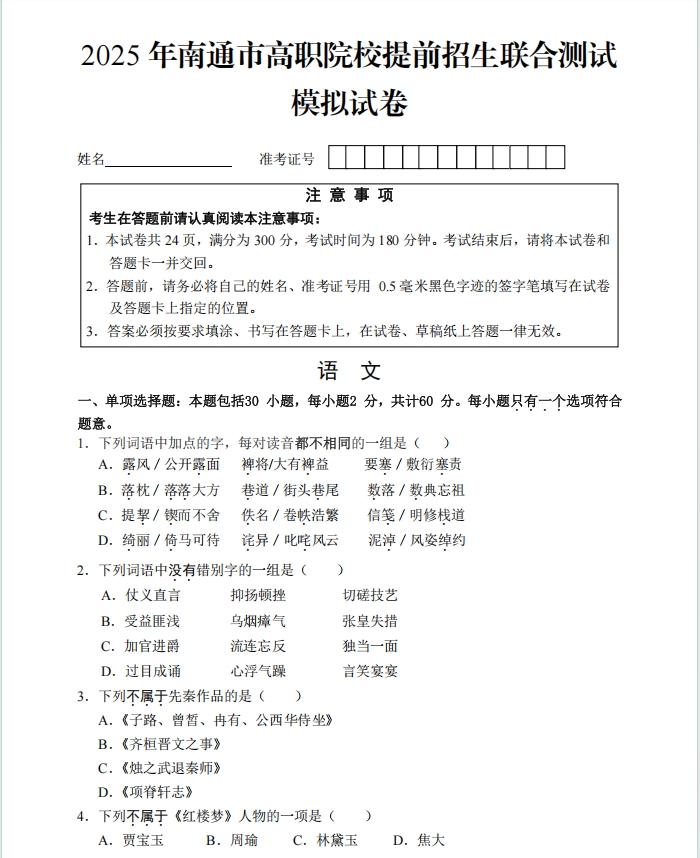 2025年南通市高職院校提前招生聯(lián)合測試模擬試卷來了,本模擬卷包含語文、數(shù)學(xué)、英語、日語、職業(yè)適應(yīng)性測試。
