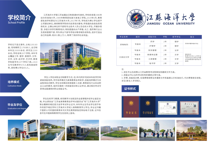 畢業(yè)條件:修完考試計(jì)劃所規(guī)定的全部課程,考試及格,通過畢業(yè)論文答辯,發(fā)放由江蘇省教育自學(xué)考試委員會(huì)和江蘇海洋大學(xué)合署的畢業(yè)證書,教育部電子注冊(cè)。