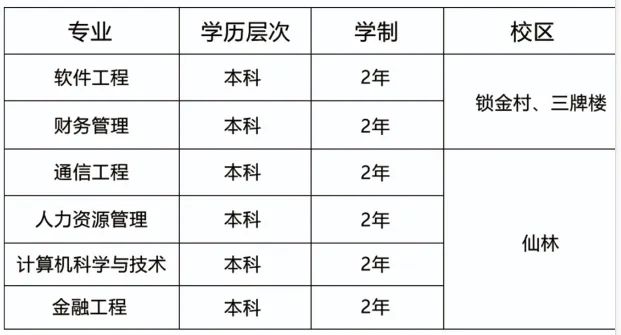 專(zhuān)接本新增了多個(gè)新興領(lǐng)域的專(zhuān)業(yè),致力于以就業(yè)為導(dǎo)向的最終目標(biāo) 2025年南京信息工程大學(xué)自考助學(xué)本科——重磅新增:財(cái)務(wù)管理 2025年江蘇第二師范學(xué)院自考助學(xué)本科——新增:財(cái)務(wù)管理、視覺(jué)傳達(dá)設(shè)計(jì)、音樂(lè)學(xué) 2025年江蘇海洋大學(xué)自考助學(xué)本科——新增:藥物制劑、漢語(yǔ)言文學(xué) 2025年南京理工大學(xué)自考助學(xué)本科——新增:社會(huì)工作、機(jī)械設(shè)計(jì)制作及自動(dòng)化(低空飛行器)、機(jī)器人工程、信息管理與信息系統(tǒng) 全日制“專(zhuān)接本”是大專(zhuān)三年制及五年制同學(xué)“專(zhuān)轉(zhuǎn)本”的備選! “專(zhuān)接本”文憑含金量?jī)H次于“專(zhuān)轉(zhuǎn)本”,如果“專(zhuān)轉(zhuǎn)本”沒(méi)有考上,那么“專(zhuān)接本”就是大專(zhuān)應(yīng)屆生再想進(jìn)入大學(xué)學(xué)習(xí)生活的唯一途徑,也是“專(zhuān)轉(zhuǎn)本”落榜的學(xué)生能夠拿到的含金量最高的學(xué)歷。 部分院校熱門(mén)專(zhuān)業(yè)報(bào)滿截班! ?對(duì)于專(zhuān)科考生來(lái)說(shuō)“專(zhuān)接本”是最佳選擇 江蘇省2025年專(zhuān)接本學(xué)校的名單如下: 南京地區(qū)院校 江蘇第二師范學(xué)院專(zhuān)接本招生簡(jiǎn)章 南京工業(yè)大學(xué)專(zhuān)接本招生簡(jiǎn)章 南京信息工程大學(xué)專(zhuān)接本招生簡(jiǎn)章 南京理工大學(xué)專(zhuān)接本招生簡(jiǎn)章 南京航空航天大學(xué)專(zhuān)接本招生簡(jiǎn)章 南京郵電大學(xué)專(zhuān)接本招生簡(jiǎn)章 南京師范大學(xué)專(zhuān)接本招生簡(jiǎn)章 南京傳媒學(xué)院專(zhuān)接本招生簡(jiǎn)章 南京林業(yè)大學(xué)專(zhuān)接本招生簡(jiǎn)章 南京財(cái)經(jīng)大學(xué)專(zhuān)接本招生簡(jiǎn)章 蘇州地區(qū)院校 蘇州科技大學(xué)專(zhuān)接本招生簡(jiǎn)章 淮安地區(qū)院校 淮陰師范學(xué)院專(zhuān)接本招生簡(jiǎn)章 南通地區(qū)院校 鎮(zhèn)江地區(qū)院校 江蘇科技大學(xué)專(zhuān)接本招生簡(jiǎn)章 揚(yáng)州地區(qū)院校 揚(yáng)州大學(xué)專(zhuān)接本招生簡(jiǎn)章 連云港地區(qū)院校 江蘇海洋大學(xué)專(zhuān)接本招生簡(jiǎn)章 01 確認(rèn)院校 南京理工大學(xué)、南京航空航天大學(xué)、南京工業(yè)大學(xué)、南京郵電大學(xué)、南京信息工程大學(xué)、南京傳媒學(xué)院(濱江校區(qū))、江蘇科技大學(xué)、揚(yáng)州大學(xué)、南京財(cái)經(jīng)大學(xué)、南京林業(yè)大學(xué)、江蘇理工學(xué)院、南京師范大學(xué)、蘇州科技大學(xué)、江蘇第二師范學(xué)院、淮陰師范學(xué)院、江蘇海洋大學(xué) 02 填寫(xiě)報(bào)名表 03 繳納報(bào)名費(fèi) 04 學(xué)校財(cái)務(wù)寄收據(jù) 05 6月底本科院校 核實(shí)信息 06 7、8月發(fā)放錄取通知書(shū) 07 按照通知書(shū)上 繳納剩余學(xué)費(fèi) 08 9月中旬本科院校 報(bào)到入學(xué) 選報(bào)院校及專(zhuān)業(yè) 所在地985/211名校、知名大學(xué)等(免試入學(xué)) 由于報(bào)考計(jì)劃具有實(shí)時(shí)性,部分專(zhuān)業(yè)、院校報(bào)滿截班,最新院校專(zhuān)業(yè)招生計(jì)劃請(qǐng)聯(lián)系招生老師獲取。 專(zhuān)業(yè)設(shè)置 學(xué)歷優(yōu)勢(shì) 1、國(guó)務(wù)院頒布的《高等教育考試暫行條例》中明確規(guī)定“高等教育學(xué)歷考試畢業(yè)證書(shū)獲得者的待遇與普通高校同類(lèi)畢業(yè)生相同”。 2、畢業(yè)時(shí)由相應(yīng)專(zhuān)業(yè)主考院校和主考委聯(lián)合頒發(fā)畢業(yè)證書(shū)、學(xué)士學(xué)位證書(shū)。國(guó)家正規(guī)學(xué)歷,國(guó)際認(rèn)可,享受普通高等院校畢業(yè)生同等待遇。 3、高等教育學(xué)歷考試是繼普通高等本科畢業(yè)證后含金量較高的,獲得文憑后,學(xué)信網(wǎng)終身可查。 報(bào)名注意事項(xiàng) 1、報(bào)名時(shí)間:即日起,報(bào)滿截班 2、報(bào)名方式:填寫(xiě)報(bào)名登記表通過(guò)資格審核,由老師在線協(xié)助完善報(bào)名手續(xù) 3、報(bào)名對(duì)象:各類(lèi)專(zhuān)科學(xué)校的三年級(jí)和五年一貫制應(yīng)屆畢業(yè)生 2025年南京理工大學(xué)專(zhuān)接本招生計(jì)劃 2025年南京林業(yè)大學(xué)專(zhuān)接本招生計(jì)劃 2025年南京郵電大學(xué)專(zhuān)接本招生計(jì)劃 2025年淮陰師范學(xué)院專(zhuān)接本招生計(jì)劃 2025年江蘇第二師范學(xué)院專(zhuān)接本招生計(jì)劃 2025年南京工業(yè) 大學(xué)專(zhuān)接本招生計(jì)劃 2025年南京師范大學(xué)專(zhuān)接本招生計(jì)劃 2025年南京信息工程大學(xué)專(zhuān)接本招生計(jì)劃 2025年蘇州科技大學(xué)專(zhuān)接本招生計(jì)劃 招生專(zhuān)業(yè) 專(zhuān)科段專(zhuān)業(yè): 學(xué)前教育、機(jī)電一體化 本科段專(zhuān)業(yè): 學(xué)前教育、廣播電視學(xué)、機(jī)械、土木工程 2025年江蘇科技大學(xué)專(zhuān)接本招生計(jì)劃 2025年南京傳媒學(xué)院專(zhuān)接本招生計(jì)劃 2025年南京航空航天大學(xué)專(zhuān)接本招生計(jì)劃 2025年南京財(cái)經(jīng)大學(xué)專(zhuān)接本招生計(jì)劃 2025年揚(yáng)州大學(xué)專(zhuān)接本招生計(jì)劃 全日制“專(zhuā